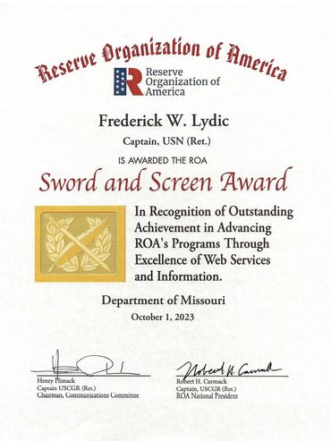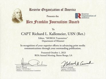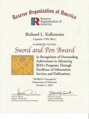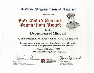 Missouri ROA is proud to announce that the MOROA TRANSMITTER Newsletter was awarded the 2024 Sword and Pen Award and the Franklin Journalism Award during the 2024 National Convention in Baton Rouge, LA. In addition, the MOROA Web Site was also recognized, receiving the Sword and Screen Award and The BG David Sarnhoff Journalism Award. MOROA was once again pleasantly surprised to be recognized for its efforts in Membership Information Services and Publications as well as Web Site Services and Information. These awards continue the recognition of MOROA efforts to communicate the mission of ROA to its members and the public through the TRANSMITTER newsletter and MissouriROA.org web site.